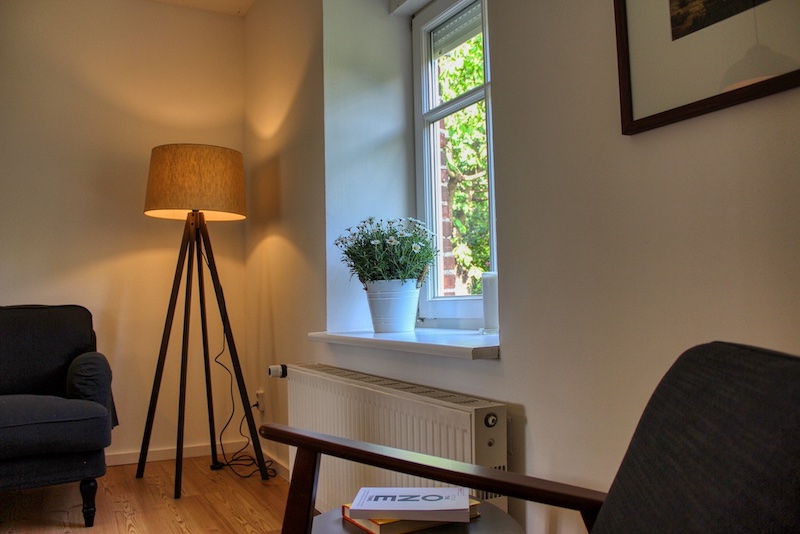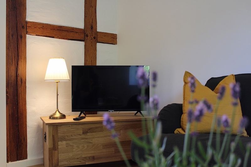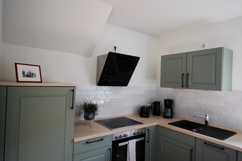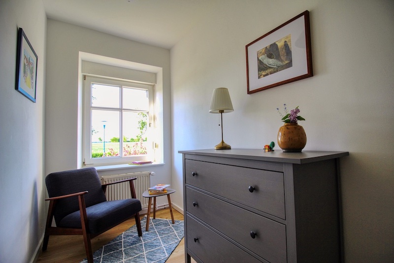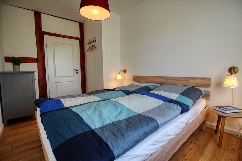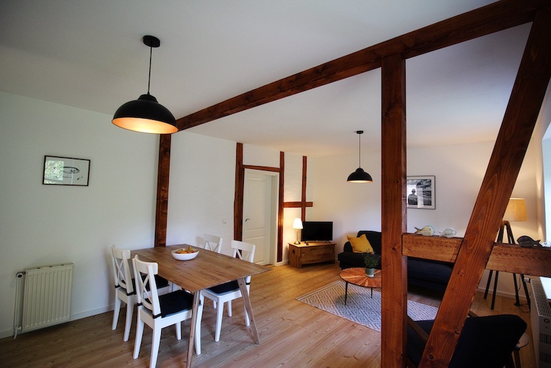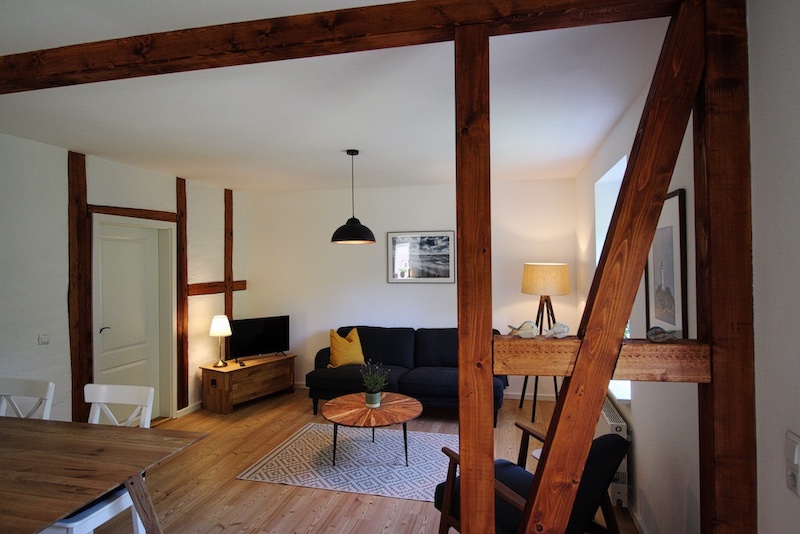 Der historische Kern des Fischerhauses ist in dieser Wohnung nicht zu leugnen. Im hübschen Wohn- und Esszimmer und dem größten der beiden Schlafzimmer haben wir das Fachwerk freigelegt und restauriert. Die dunklen Holzbalken, gepaart mit der erhaltenen weißen Lehmwand und einer modernen Einrichtung, machen den besonderen Reiz der Räume aus.