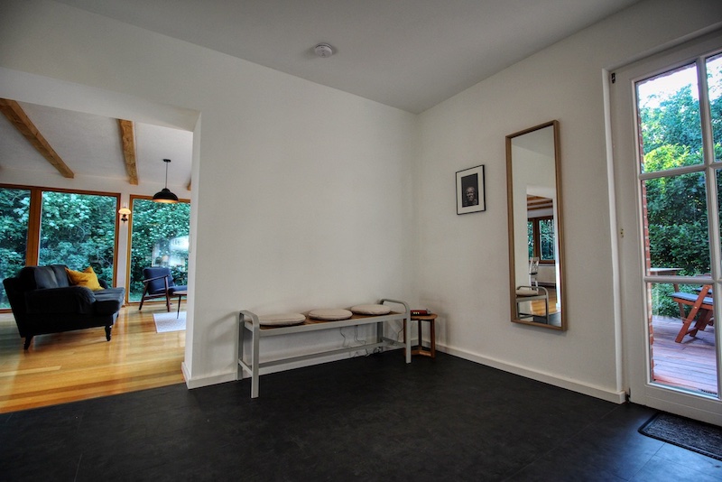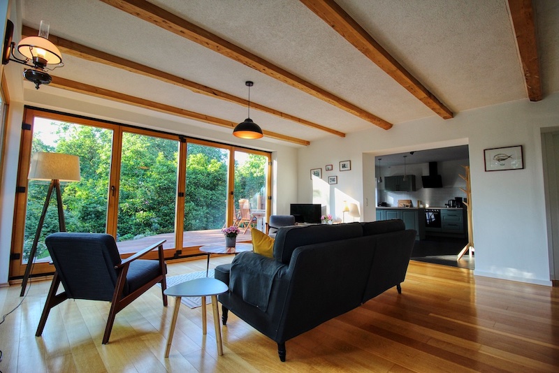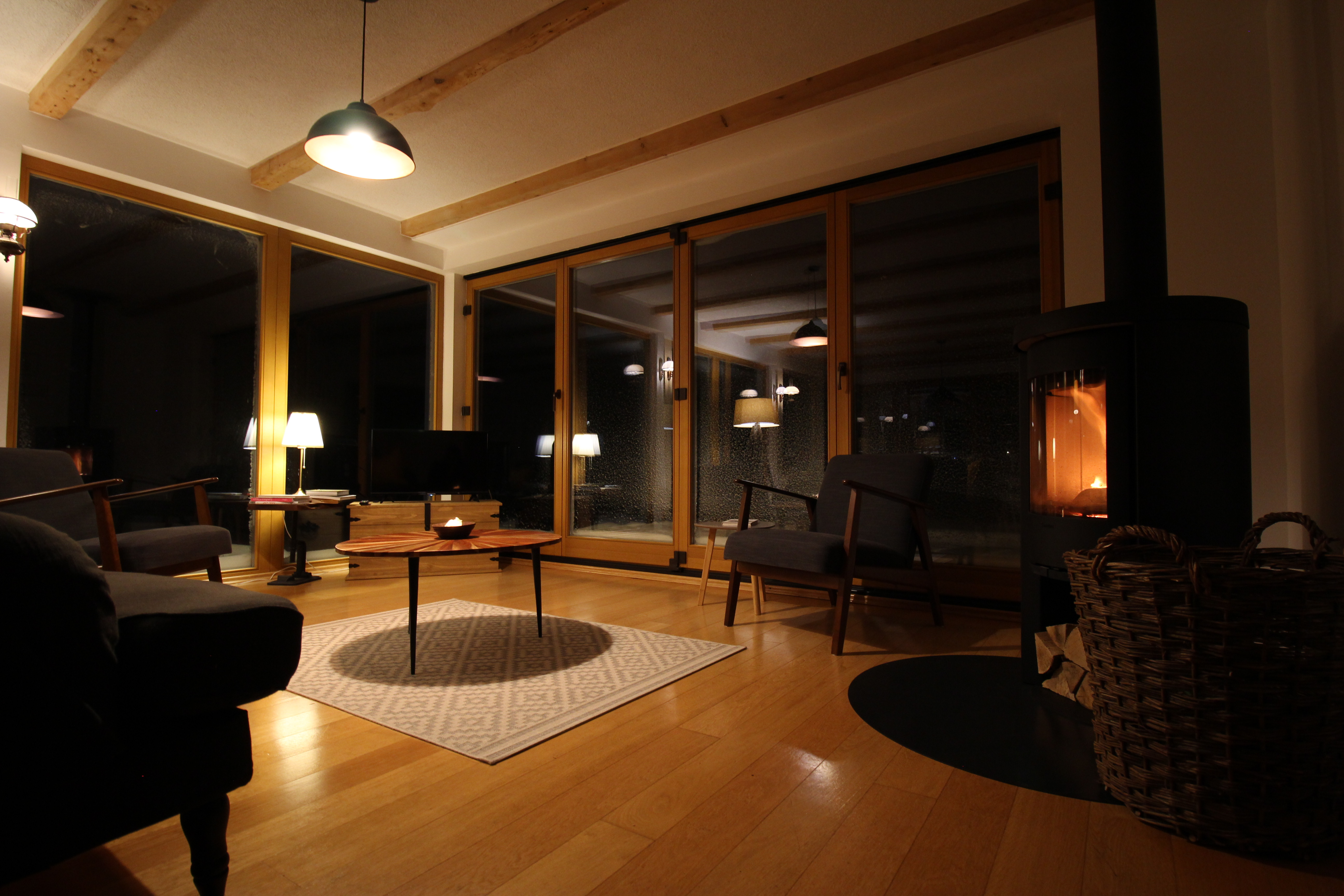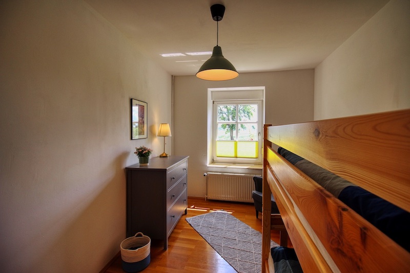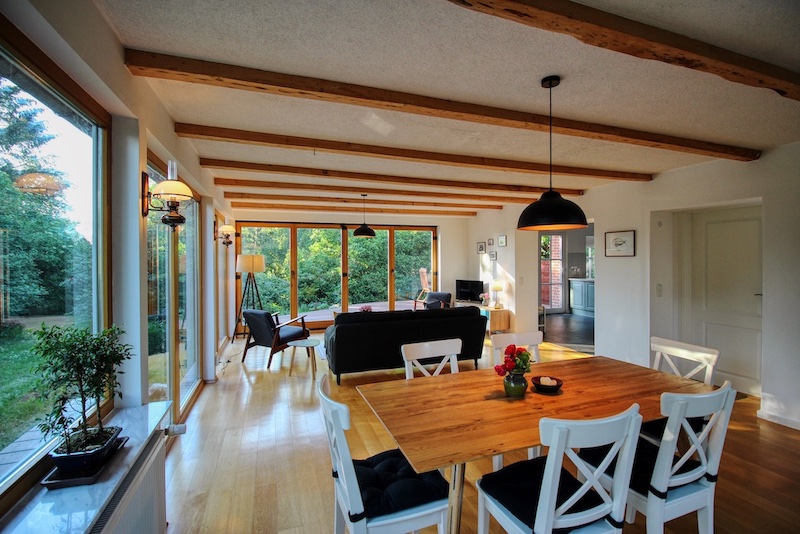 Lichtdurchflutet und hell, der große Wintergarten mit bodentiefen Fenstern bietet einen tollen Ausblick ins Grüne. Bereits nach dem Aufstehen kann man die Vögel beobachten, wie diese durch den alten Obstgarten oder kleinen Wald fliegen. Und im Herbst oder Winter machst du einfach den Kamin an und genießt den Ausblick umso mehr, während du das Holz knistern hörst. Dies macht den besonderen Charme der Ferienwohnung aus.